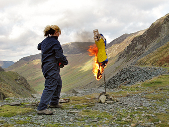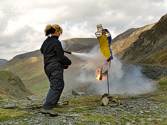 | It took us over an hour to set it up. I had my goggles, my sexy boiler suit (!) and even my bright red fire extinguisher. We poitioned the dress on a basketwork mannequin and placed it on the edge of a precipice, rather like a 'Wickerman'. Marti turned up from ITV Border to interview me and film the proceedings for Lookaround, while Brian Sherwen, a well-known local photographer joined us with his grand-daughter, Lauren, to take pictures for Honister.com. The only hitch was the wind, which nearly blew the dress over ithe precipice, and made igniting the dress very tricky, despite the 'blue touchpaper' I had prepared earlier! Then my gas burner ran out of gas and I couldn't replace the cartridge. Luckily the boys at Honister were supervising closely so they came to my rescue with a little magic formula. Photo: coutesy Brian Sherwen |