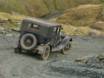 | Above: Derwentwater with Skiddaw, from near Lodore; Left: a 1923 Bugatti Brescia - probably worth it's weight in gold!; Below: an American sedan which couldn't have been more out of place on a bleak Cumbrian mountainside ... where was Al Capone or the Great Gatsby? |