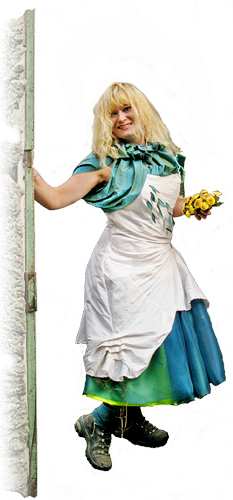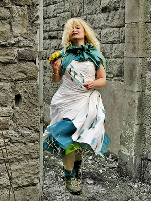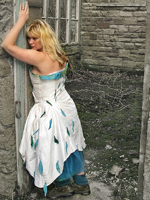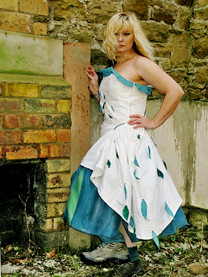 | 21 February 2011: "GIGGLE ALLEY" With the forest campaign flying around my head a new design was bugging me for days. So here it is. Actually its the the second maybe I should make a collection inspired by forests (ha what a brill idea) . The first one was made few years ago, inspired by another forest - the wooded valley of Tilberthwaite. It was a bridal dress , and because it still fitted me, and seemed so appropriate, I couldn't resist redesigning it to wear for the Grizedale rally a few weeks ago. |