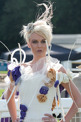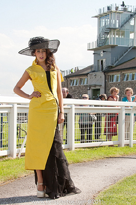 | Selection of photographs from the Charity Race Night Fashion Show at Cartmel Races (left to right, top to bottom): Steph modelling 'Ordinary Girl' (Alternative Royal Wedding Dress); Rachel modelling 'Black Widow' (RedDress:BlackDress) Lucinda with 'Midnight Sun' (Pyromania); Lucinda again, this time with 'Montreal No.4' (RedDress:BlackDress); and Brooke with 'Solway Sunset' (Spectrum in Four Seasons) All photographs copyright Mike Kells; Hats by Tracy Wells - The Hat Box. |