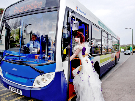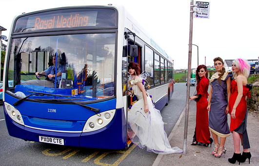 ![]() Bride and her entourage at the church (Moresby). Photograph: Brian Sherwen PRESS RELEASE - 13 APRIL, 2011 FASHION DESIGNER CREATES 'ORDINARY GIRL' ROYAL WEDDING Avant-garde fashion designer, Angy Morton, has organised an unusual fashion shoot to pose the question, "What if the heir to the throne had really chosen an 'ordinary' girl to be his bride? See PRESS PAGE and below for full details Stagecoach bus to Royal Wedding. Photograph: Brian Sherwen |
