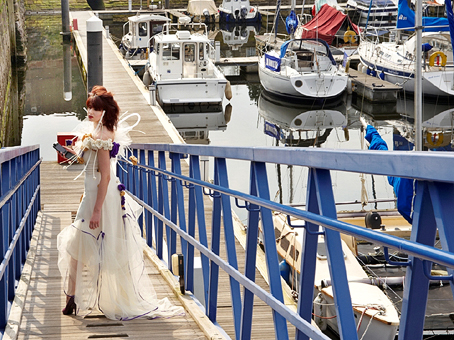 After an early start and caffeine fix, the day started very well. It was hard work but also good fun, and a real team effort. I had four aspiring models, two photographers Brian Sherwen, and his grand-daughter Lauren, and two assistants from Vibralife, Carlisle for hair and make-up. Our base for the day was Whitehaven Marina which was perfect for our needs. Brian, our photographer, was also our location manager but despite him knowing the town like the back of his hand there was one challenge that was just too much even for him to find graffiti for an edgy, urban backdrop. Whitehaven is so clean and tidy nowadays that we had to make do with a couple of dilapidated buildings and even then we had to wait for the sun to slide behind a cloud so that they werent too bright! Our key locations were used to create cameos based on the ordinary girl theme. They included as you will see from the pictures when we publish them in a few days the harbour, the multi-storey car park, my favourite fish and chip shop, an ice cream van, a typical council estate and of course the church. We also had fun filming our bride waiting for a bus for part of the afternoon every bus arriving in Whitehaven from Workington and Maryport carried the destination Royal Wedding thank you Stagecoach! I had another idea for a stunt to finish off the day but I was worried that the dress would end up ruined so I will keep it for the next photo shoot. All in all it was a fantastic day. Everybody worked well together and from the photos I have seen so far it was certainly successful. I will be releasing images in due course so in the meantime you will have to make do with a few backstage shots. |